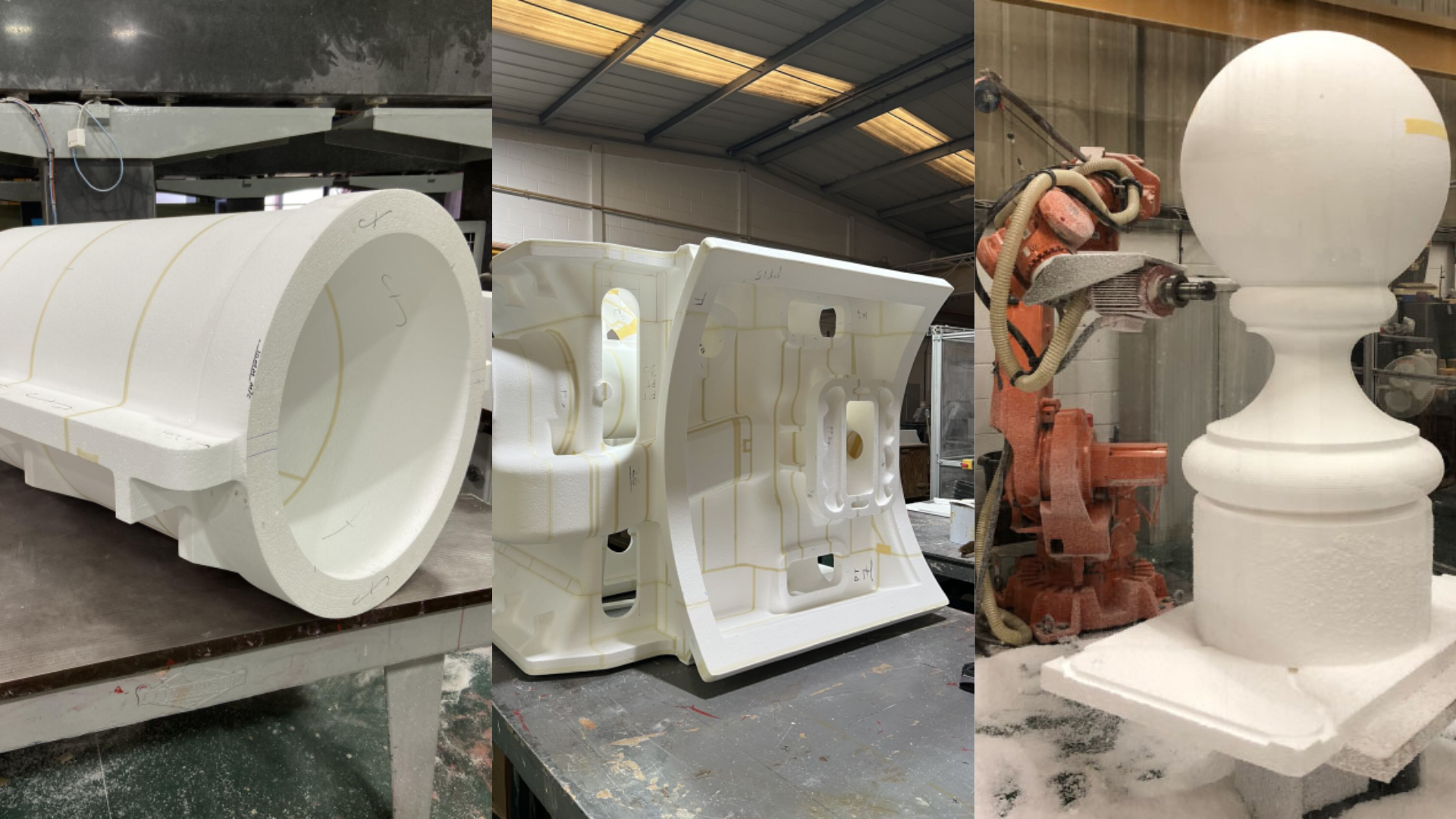 Robots offer a flexible, high-precision alternative. By leveraging 5-axis robotic machining, polystyrene blocks can be shaped directly from CAD data in a single setup. This means: