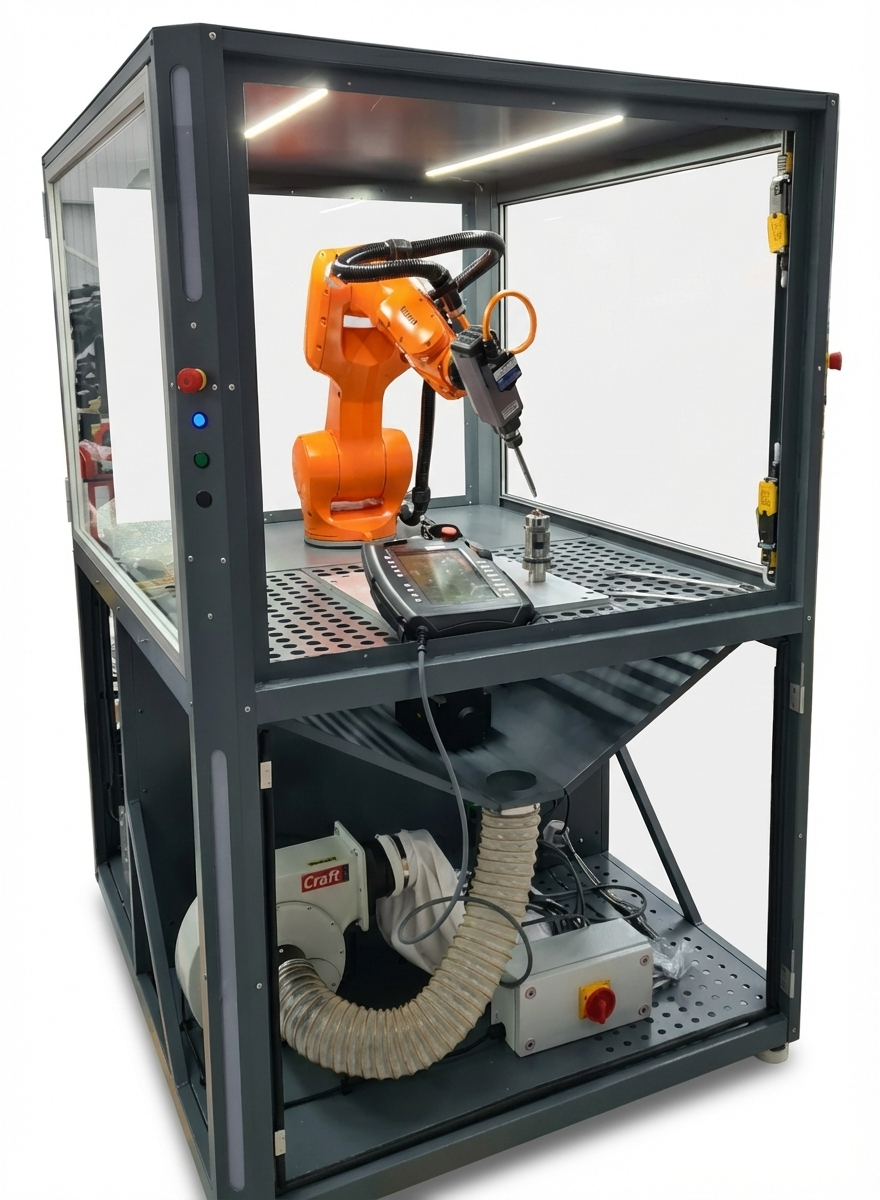 The integrated extraction unit manages swarf and dust at source, keeping the cell clean and operators safe. The rotating table extends the system's capability beyond a standard 6-axis setup, allowing the robot to access complex part geometry without manual repositioning and providing a solid foundation for operators learning multi-axis CAD/CAM programming and robotic process development.