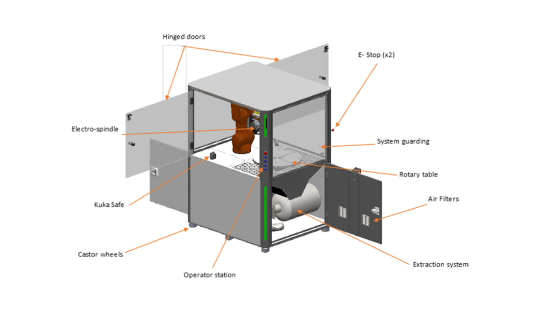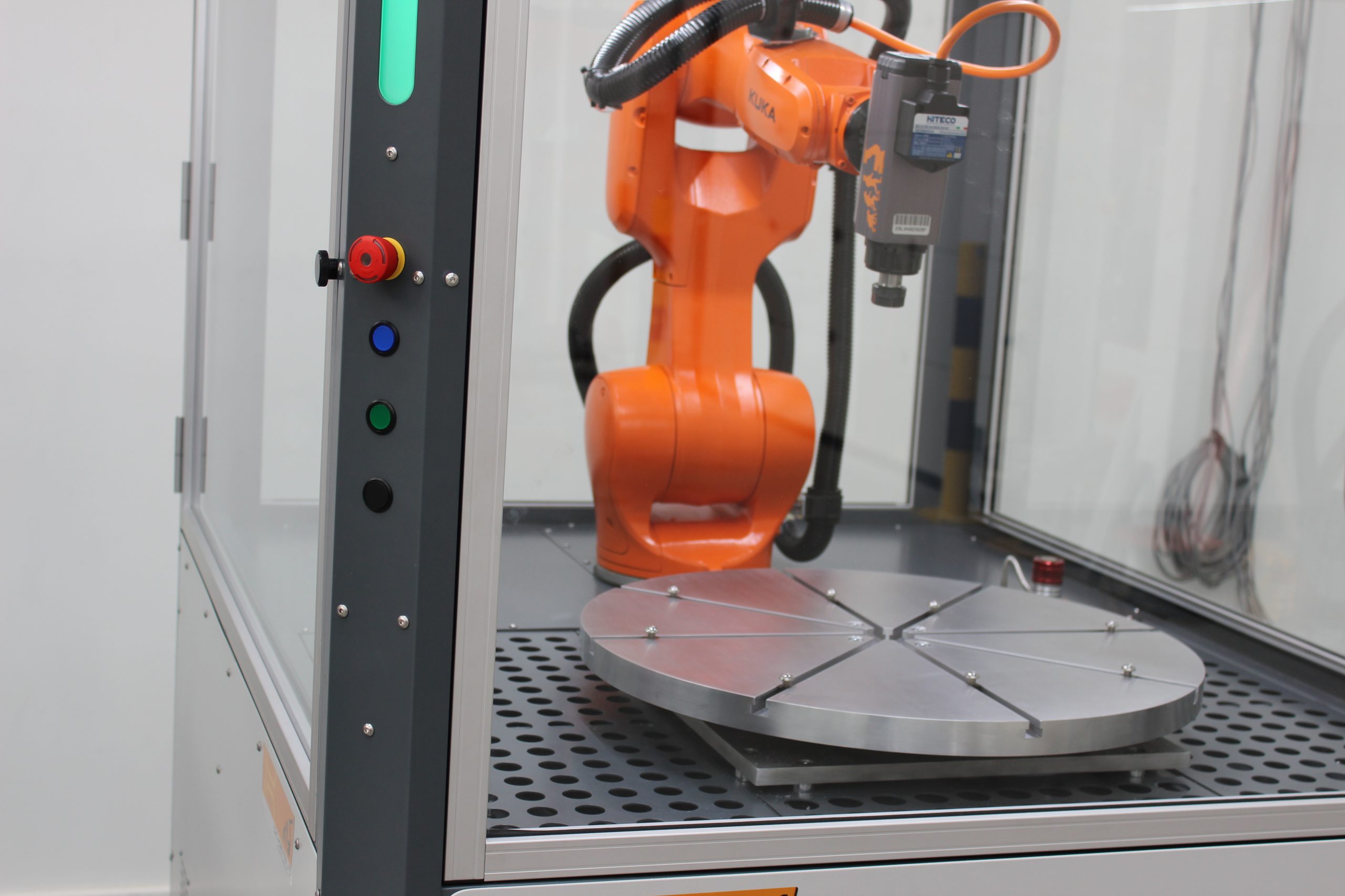 The Cell4Milling is built around a KUKA KR10 R900 Agilus industrial robot paired with a Hiteco electro spindle and a 7th axis rotating table, delivering machining capability within a self-contained enclosure measuring just 1200 x 800 x 2000mm. The compact footprint requires no specialist groundworks or facility modification — the cell arrives pre-integrated and ready to deploy.